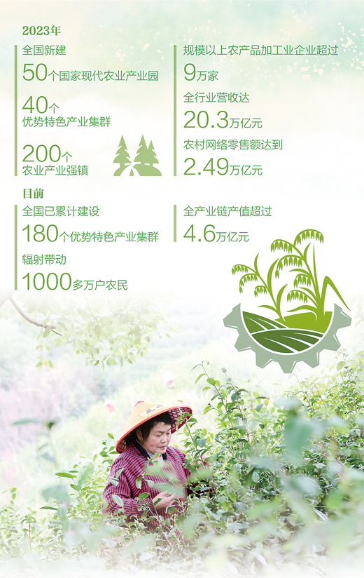 产业振兴是乡村全面振兴的基础。近年来,乡村产业发展如火如荼。去年,我国新建50个国家现代农业产业园、40个优势特色产业集群、200个农业产业强镇,有力推动乡村产业提档升级。