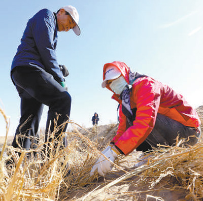甘肃省张掖市高台县,志愿者在扎草方格沙障。 |