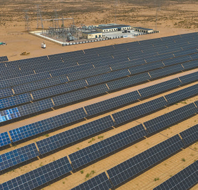 内蒙古自治区巴彦淖尔市磴口县,整齐排列的光伏板起到防风、阻沙的作用。 |