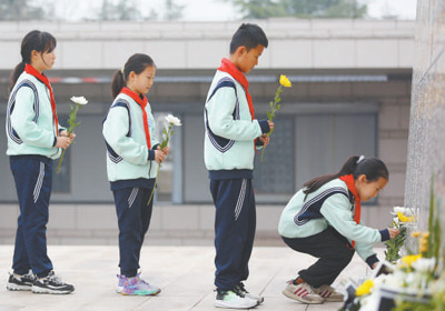 山东枣庄市薛城区临山小学学生在革命先烈纪念碑前敬献鲜花。 李志军摄(影像中国)