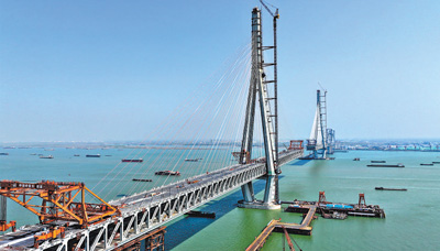 过江通道 江苏常泰长江大桥是长江经济带综合立体交通走廊的重要项目,也是世界首座集高速公路、城际铁路和普通公路为一体的过江通道。建成通车后,泰州与常州之间公路通行仅需20分钟。图为3月24日,进入全桥合龙冲刺阶段的常泰长江大桥。 孙 璐摄(人民视觉) |