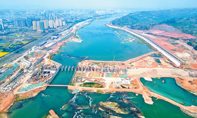 水利枢纽 四川省重点项目岷江彭山尖子山航电枢纽工程,位于眉山市彭山区,是兼具航运、航电、水环境综合整治和防洪等功能的水利枢纽,未来年平均发电量将达2.8亿多千瓦时。图为3月13日,岷江彭山尖子山航电枢纽工程建设现场。 翁光建摄(影像中国) |
