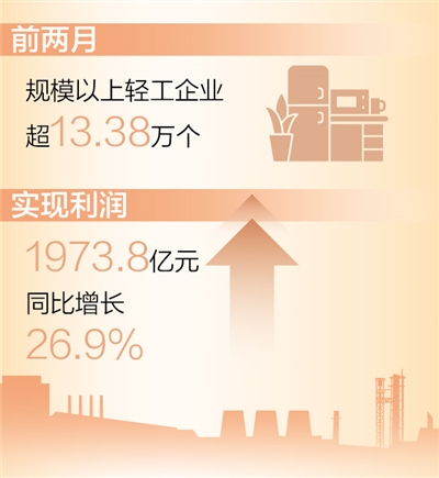 盈利持续改善。前两月,规上轻工企业营业收入利润率为6.1%,同比提高1.1个百分点,高于规上工业1.4个百分点,高于制造业2.4个百分点。其中,部分轻工行业利润快速增长,造纸、家具、文教工美行业利润分别增长3.37倍、1.98倍、50.4%。