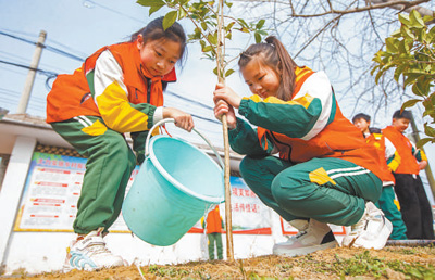 开展全民义务植树是推进国土绿化、建设美丽中国的生动实践。近年来江苏省积极组织义务植树活动进校园,提升学生爱绿植绿护绿意识。图为海安市南莫镇中心小学学生在唐庄河岸边参与义务植树活动。 |