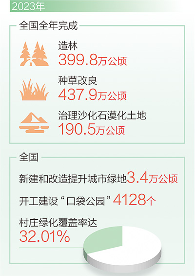 “增绿就是增优势,植树就是植未来。”国土绿化状况公报显示,2023年全国完成造林399.8万公顷、种草改良437.9万公顷、治理沙化石漠化土地190.5万公顷;持续推进“互联网+全民义务植树”,全年上线发布各类尽责活动2.4万多个,网络平台访问量近4.4亿次,初步实现尽责形式多样化和公众参与便捷化。