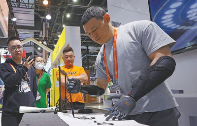 中国品牌博览会上,工作人员用脑机科技操控的假肢写毛笔字。 |