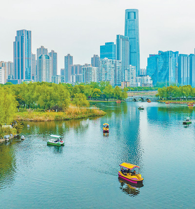 4月6日,湖北省武汉市沙湖湿地公园绿意盎然,市民和游客泛舟湖上、欣赏春景。