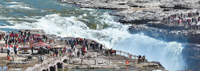 4月23日,游客在黄河壶口瀑布观赏“清流飞瀑”景观。近日,受上游降雨量较少和水库调节水量影响,黄河晋陕峡谷水流变缓、变清,壶口瀑布出现“清流飞瀑”景观。