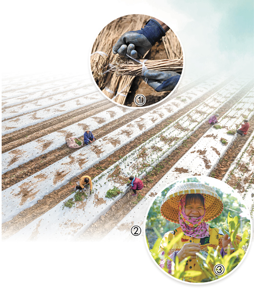 图①:甘肃省定西市岷县梅川镇中药材标准化种植基地内,药农在整理黄芪种苗。 |