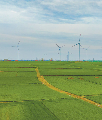 江苏省宿迁市泗洪县上塘镇,绿色田野与风力发电机组构成美丽风景。 张连华摄(人民视觉)