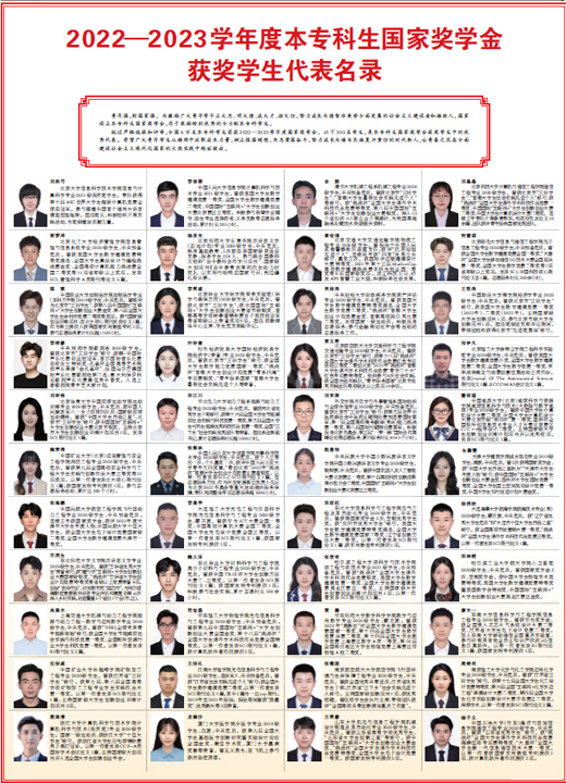 经过严格选拔和评审,全国6万名本专科学生荣获2022—2023学年度国家奖学金。以下100名学生,是本专科生国家奖学金获奖学生中的优秀代表。希望广大青年学生从榜样中汲取成长力量,树立报国理想,矢志爱国奋斗,努力成长为堪当民族复兴重任的时代新人,让青春之花在全面建设社会主义现代化国家的火热实践中绚丽绽放。