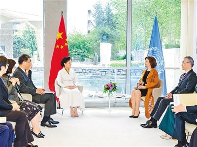 当地时间5月6日上午,国家主席习近平夫人、联合国教科文组织促进女童和妇女教育特使彭丽媛在巴黎应邀参访联合国教科文组织总部并会见阿祖莱总干事。 |