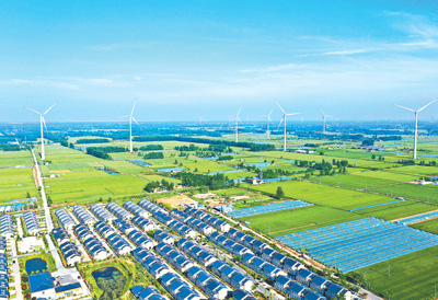 江苏省睢宁县积极发展清洁能源产业,多个风力发电和光伏发电项目投入运行,有力促进当地经济发展,提升能源供给保障能力。图为睢宁县魏集镇,风力发电机组与村居、农田相映成景。