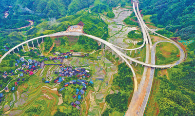 为助力乡村全面振兴,广西壮族自治区融水苗族自治县大力推进“四好农村路”建设,完善交通路网,满足产业发展、群众出行等需求。图为5月15日拍摄的融水县四荣乡在建公路,与梯田、绿树、民居相互映衬。