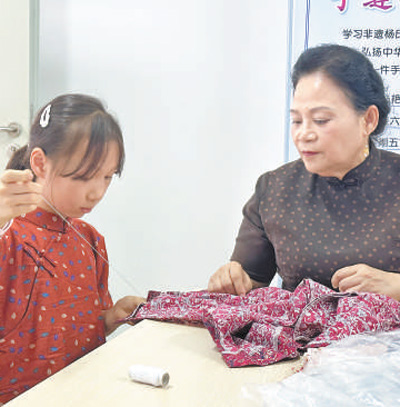 行针、倒针、三角针、星点缝……周五下午,广东省深圳市龙岗区悦澜山实验小学“四点半课堂·非遗进校园”活动教室里,杨氏旗袍制作技艺非遗传承人唐光艳细心讲解,小学员们专心缝制。“我去年开始参加旗袍制作课程,感觉很有意义,能了解很多课堂上学不到的知识。”四年级(4)班学生凌梦嫣说。