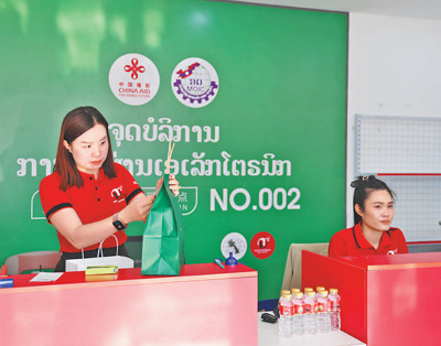 老挝万象一处快递收发站的工作人员为电商快件粘贴标签。 |
