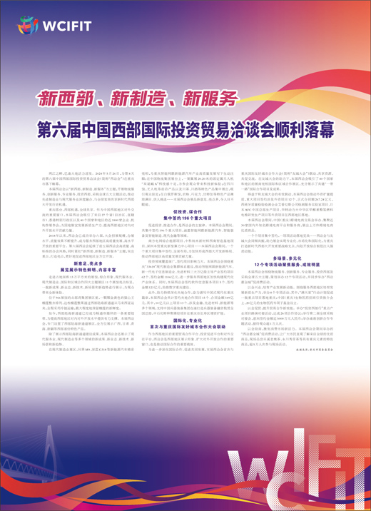 2018年以来,西洽会已成功举办六届,大会招展规模、办展水平、质量效果不断提升,成为服务西部地区高质量发展、高水平开放的重要平台。第六届西洽会延续了前五届西洽会高质量、高标准的办会风格,同时紧扣“新西部、新制造、新服务”主题,突出重点、打造亮点,更好地促进西部地区全方位开放。