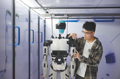 浙江湖州市南太湖新区的浙江大学湖州研究院实验室内,科研人员对人形机器人进行调试。 |