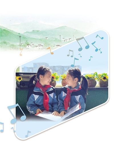 讲台上,随着廖光新的双手向前一打开,学生们齐刷刷地唱了起来。“今天天气好,去找嘎嘎(外婆)喽……”稚嫩而清脆的声音瞬间充满整个教室,透过窗户传向远处的大山。
