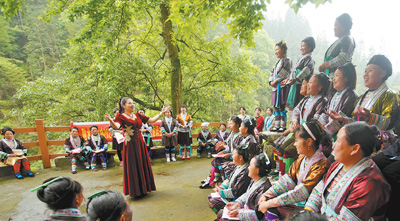 广西壮族自治区柳州市融水苗族自治县政协日前举行“建设铸牢中华民族共同体意识示范区 委员行动”主题活动,政协委员同法律、医务工作者等来到杆洞乡乌英苗寨,开展法律咨询、文艺表演、实用技术传授等志愿服务活动,使政协工作更接地气、暖民心。图为在乌英苗寨,苗族群众观看政协委员表演文艺节目。