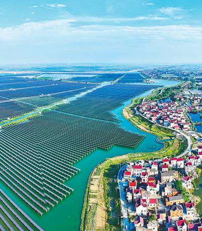 近年来,安徽省马鞍山市当涂县大力发展渔光互补太阳能光伏发电新能源产业,将清洁电能用于生产,助力乡村全面振兴。图为日前拍摄的当涂县大陇镇双潭湖渔光互补光伏电站。
