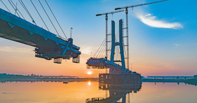 5月28日,湖北省荆门市,沪渝蓉高铁钟祥汉江特大桥建设加紧施工,冲刺合龙。