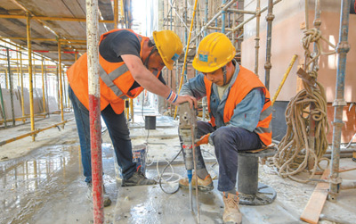 在埃及新行政首都中央商务区施工现场,中国工程师指导埃及“鲁班学院”学员施工作业。 |