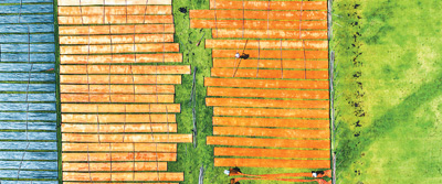 6月2日,在广西壮族自治区梧州市蒙山县丝绸产业园区一家丝绸企业的晒坪上,工人趁天气晴好,对香云纱进行晾晒、卷收等工作。
