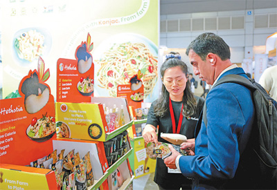 参观者在一家中国魔芋食品企业展台前了解产品情况。 |