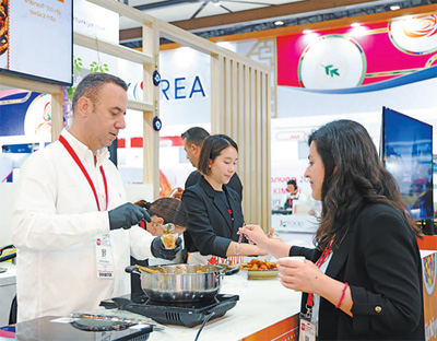 土耳其食品展台前,工作人员邀请参观者品尝特色食物。 |