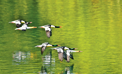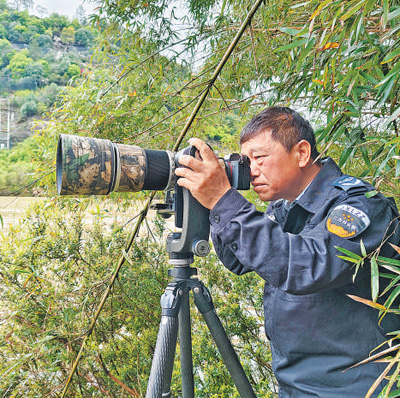 身处其间的老肖却无暇欣赏——只见他小心翼翼地放稳三脚架,架上相机,“瞄准”水面上正在嬉戏的两只中华秋沙鸭,严阵以待。“扑棱扑棱”“咔嚓咔嚓”……鸭子扇动翅膀,霎时起飞,老肖迅速按下快门,捕捉这美好的瞬间。