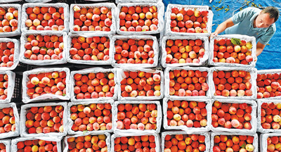 图为日前,村民在萱洲镇衡山岳期水果种植基地搬运红脆桃。