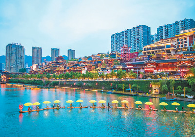 6月4日,湖北省恩施土家族苗族自治州宣恩县贡水河上,游客在体验“贡水游龙”旅游项目。“贡水游龙”由数十条竹筏作“龙身”,辅以灯光、音乐,游客们可乘船观赏璀璨夜景。