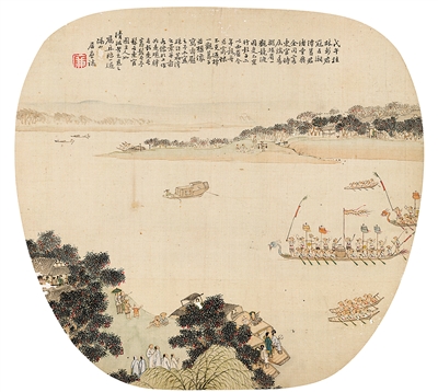 居巢的扇面绘画《赛龙舟图》虽为咫尺之属,但小中见大,清晰再现了当时广东地区龙舟竞赛的情形。从画面及人物衣着来看,或为画家的好友张嘉谟观摩龙舟竞赛,画家据此写实。无独有偶,在居巢创作此画的次年,其堂弟居廉也绘制了一件相似之作——《端阳龙舟竞渡图》。扇面宽不盈尺,但两船竞渡、小船助阵、观众围观的场景均鲜活灵动。与居巢之作不同的是,居廉画作中的龙舟竞赛是两船朝同一方向速进,前方有一艘小船导引。两种竞赛模式,时间仅相隔一年,或可为民俗学者提供参考。此外,从居廉的题识可知,此画乃忆写珠江荔湾地区龙舟竞渡之景,画中部分人物系画家好友。因此,这件作品不独为研究晚清风俗画提供佐证,更可印证彼时岭南画坛写实之风。