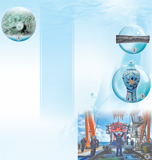 图①:深潜设备对水下文物进行提取。 |