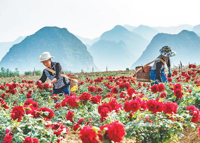 云南省文山壮族苗族自治州丘北县,普者黑玫瑰花种植基地的1000多亩高原墨红玫瑰花获丰收,这些玫瑰花可用于制作玫瑰花饼、玫瑰酱、玫瑰糖等食品。丘北县大力发展特色产业,发展食用玫瑰种植加工业,带动当地农户增收,推进乡村全面振兴。图为花农们在普者黑玫瑰花种植基地采摘。