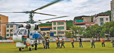 6月17日,广东省梅州市平远县体育场,直升机在运送救援物资。 |