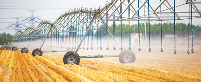 6月17日,在山东省东营市广饶县李鹊镇前艾家村的田地里,农民正在使用桁架式喷灌机浇地。 |