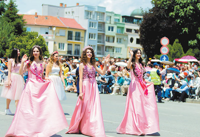 每年6月的第一个星期日是保加利亚传统节日——玫瑰节,该国中部的“玫瑰谷”地区会举行盛大的庆祝活动。当地民众穿上传统服饰,女孩头戴玫瑰花环,跳起欢快的民族舞蹈(见图一,黄俊摄)。满地的玫瑰花瓣,为节日增添了喜庆气氛。