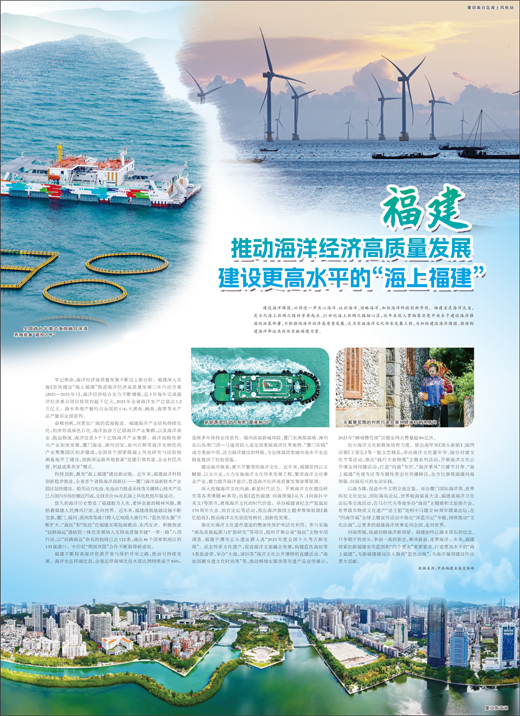 奋楫扬帆,向更加广阔的蓝海挺进。福建海洋产业结构持续优化,初步形成绿色石化、海洋旅游万亿级海洋产业集群,以及海洋渔业、航运物流、海洋信息3个千亿级海洋产业集群。海洋战略性新兴产业加快发展,厦门海沧、漳州诏安、泉州石狮等海洋生物医药产业聚集园区初步建成,全国首个国家级海上风电研究与试验检测基地开工建设,创新深远海养殖装备“党建引领共富、企业村民共营、利益成果共享”模式。