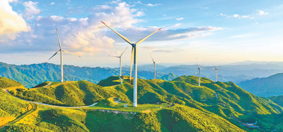 近年来,湖南省郴州市积极发展清洁能源产业,投入运行多个风力发电和光伏发电项目,有力促进当地能源结构转型。图为郴州市桂阳县白水瑶族乡的风力发电机组矗立山巅、有序排列。