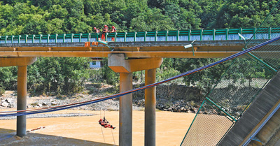 7月21日,救援人员转移四川雅安市汉源县马烈乡新华村村民。