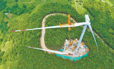 7月22日,重庆市黔江区麒麟二期风力发电项目工地上,风电风机叶片吊装作业正在进行。