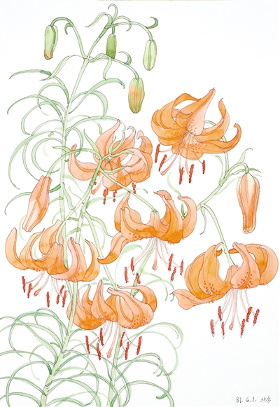 水粉画《细叶百合》,作者常沙娜,中国美术馆藏。