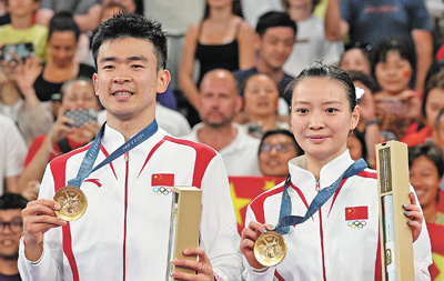 郑思维(左)/黄雅琼在展示羽毛球混双金牌。 本报记者 雷 声摄