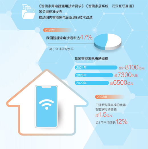 从智能电视到智能音箱、智能厨电,近年来各类智能家电持续上新,激发消费需求不断释放。数据显示,2022年我国智能家电市场规模超6500亿元,2023年超7300亿元,预计2024年将达8100亿元。
