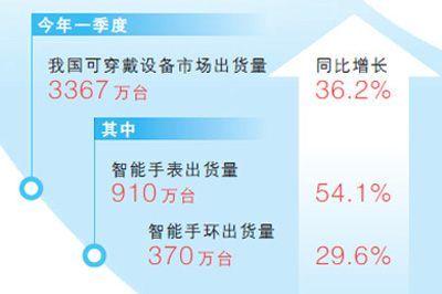 近年来,随着移动互联网普及应用以及人工智能科技浪潮涌动,我国智能穿戴设备产业快速发展。今年一季度,我国可穿戴设备市场出货量为3367万台,同比增长36.2%。其中,智能手表市场出货量为910万台,同比增长54.1%;智能手环市场出货量为370万台,同比增长29.6%。