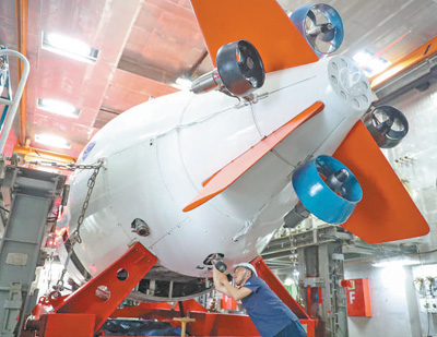 8月11日,科考队员在对“蛟龙号”载人潜水器照明系统进行检查。