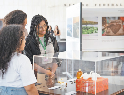 在“纽带:美丽的巴西,美丽的中国”展览上,参观者欣赏中国工艺品。 |
