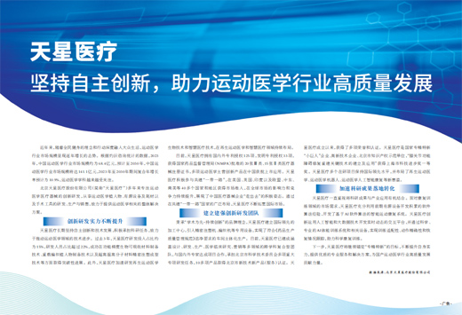 北京天星医疗股份有限公司(简称“天星医疗”)多年来专注运动医学医疗器械的创新研发,从事运动医学植入物、有源设备及耗材以及手术工具的研发、生产与销售,致力于提供运动医学相关的整体解决方案。